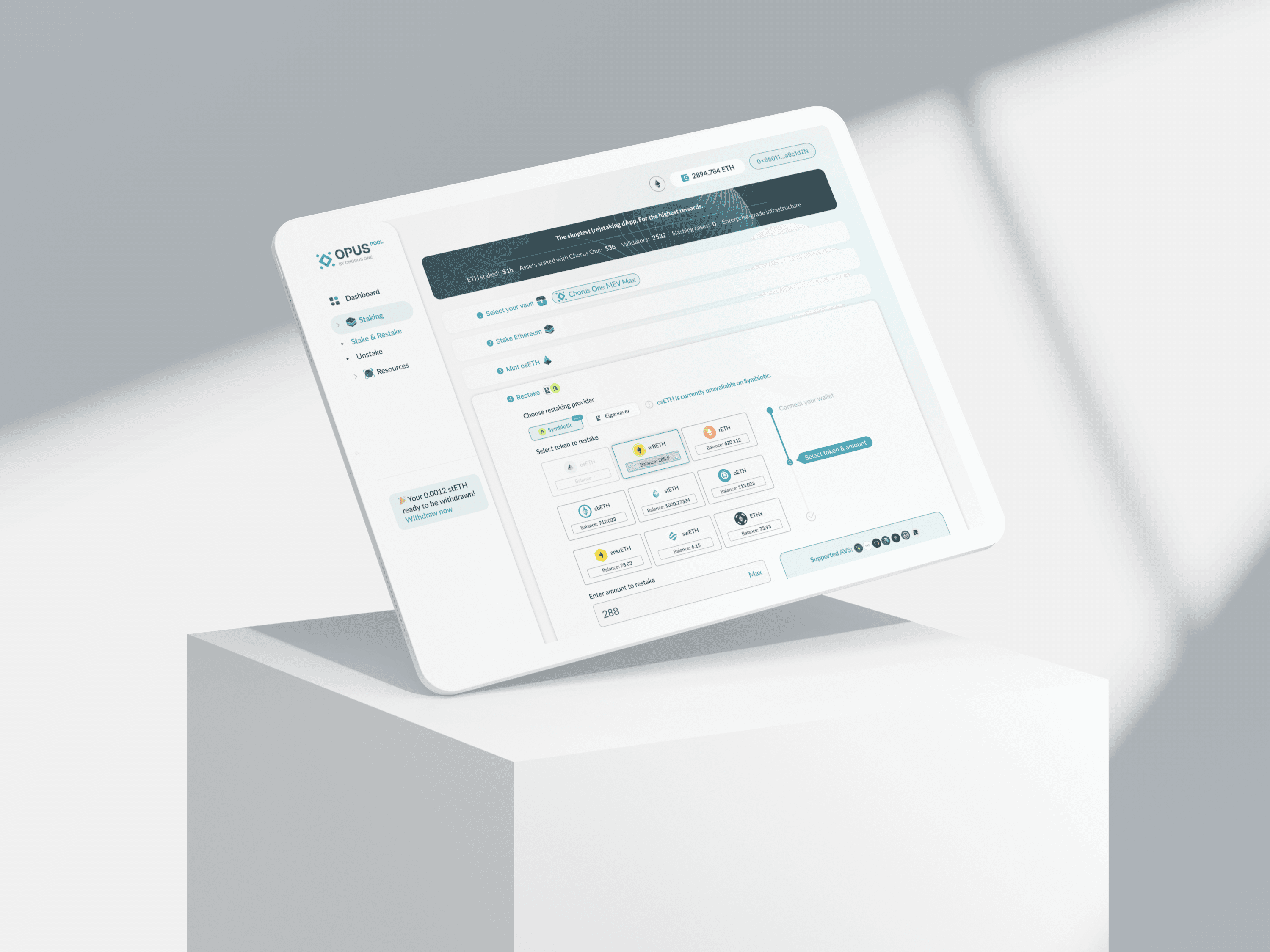 As lead UI/UX designer for OPUS (by Chorus One), I designed a staking interface that simplifies non-custodial Ethereum staking for developers and institutional users. The focus was on making complex staking workflows clear, efficient, and easy to navigate.