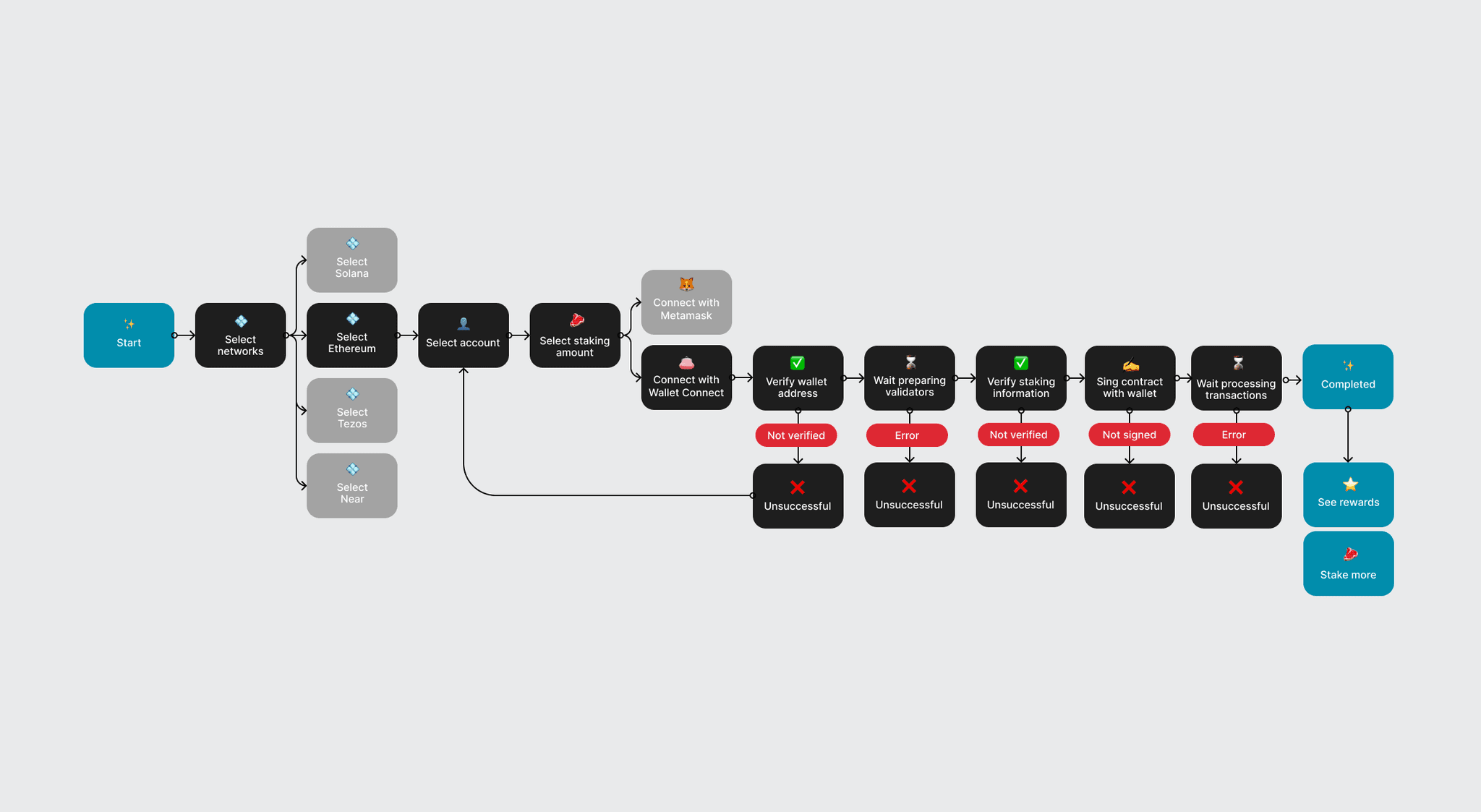 I conducted interviews with developers and validators to identify friction in existing staking tools. Based on this research, I designed modular wireframes and interaction flows centered on progressive disclosure — presenting essential information upfront while keeping advanced functionality accessible.